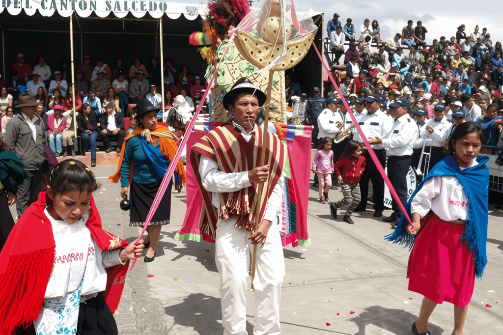 Las Fiestas del Inti Raymi en Salcedo se celebran cada 20 de junio en honor al Taita Inti (Padre Sol) y a la Pacha Mama (Madre Tierra). Durante esta tradición ancestral, los pobladores agradecen las abundantes cosechas mediante danzas, música y coloridos desfiles por las calles del cantón. Al ritmo del bombo, el rondador y las guitarras, los danzantes y acompañantes festejan la generosidad de la tierra, mientras grupos folclóricos, el famoso Diablo Huma y la comunidad se unen en alegría, música y cultura. Es una celebración que combina tradición, gratitud y diversión, mostrando la riqueza cultural y espiritual de Salcedo. Cada año, miles de visitantes se acercan para vivir esta experiencia única y sumergirse en la magia del folclore andino.